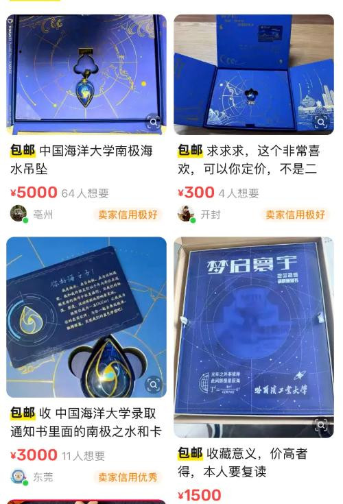 中国海洋大学今年的录取通知书附赠“南极海水吊坠”,被网友称为“全网最浪漫录取通知书”。但很快就有人发现,它在二手平台上被炒到1800~5000元。南京大学带有纪念邮票的纪念礼盒,也标价数百至上千元。卖家大多是刚收到录取通知书的2025级新生,有人整套售卖,也有人单独出售录取通知或其中的某个纪念品。