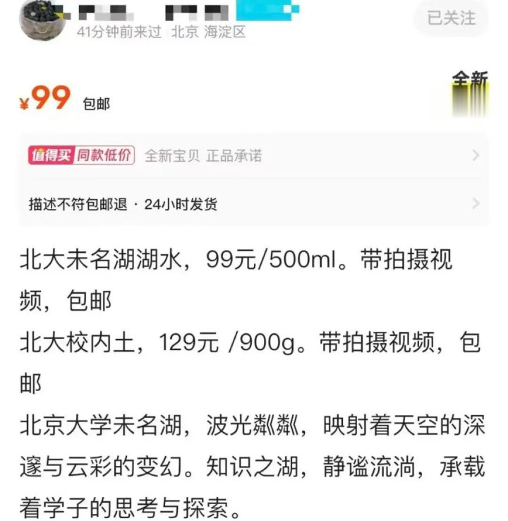 在二手平台上,除了录取通知书,一些更“匪夷所思”的商品时有出现。500毫升的北京大学未名湖湖水,被标价20元到100元不等;900克的北大校内土壤则被卖到129元。商家还表示,这些拍品均附带拍摄视频,以证明它们确属“北大出品”。“(北大校内土)对多种植物生长具有神奇效果,有助于调节空气湿度。每日凝视未名湖湖水,可提振精神,激发智慧。”