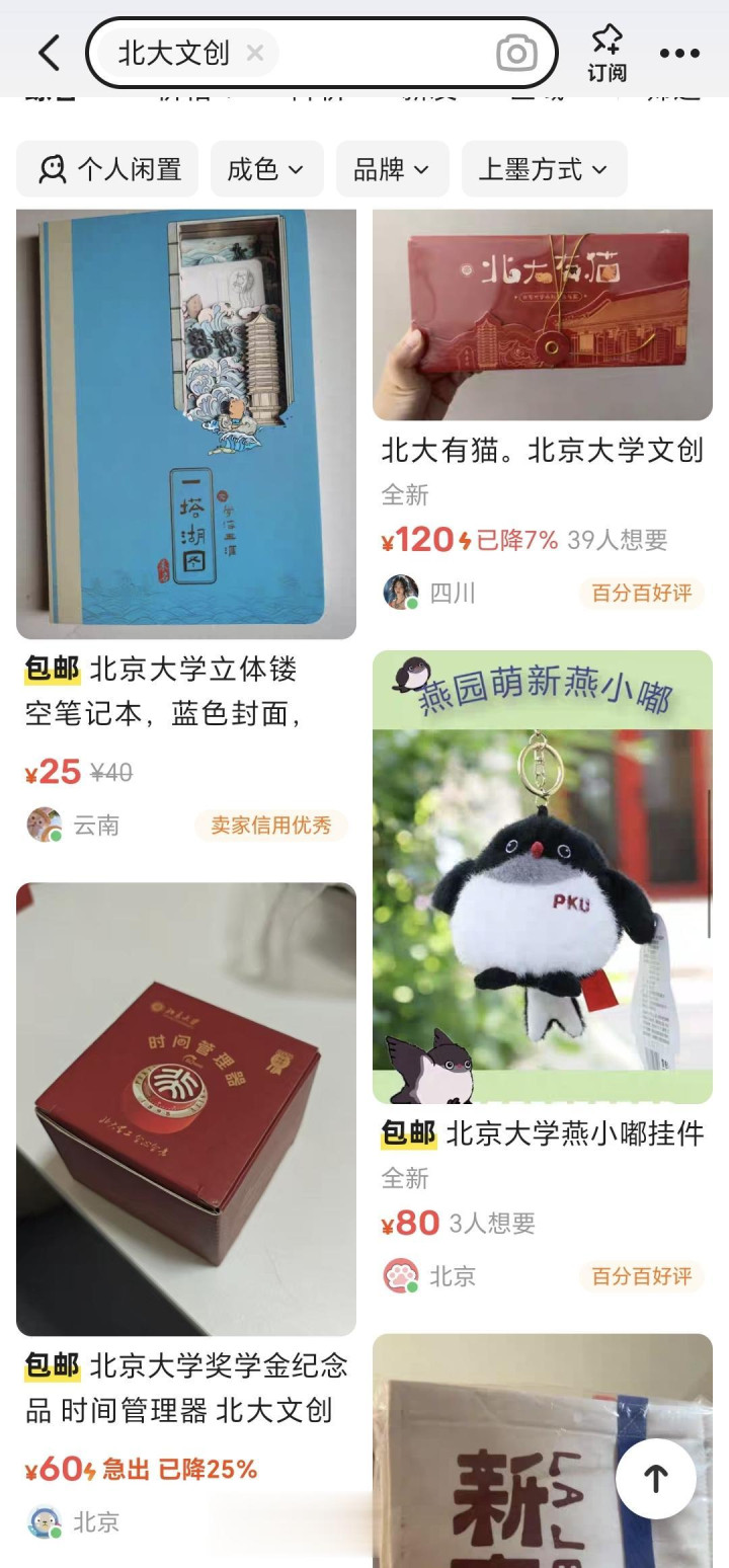 在二手平台上搜索“北大文创”,还能找到校内奖学金的纪念品。(图/二手平台截图)